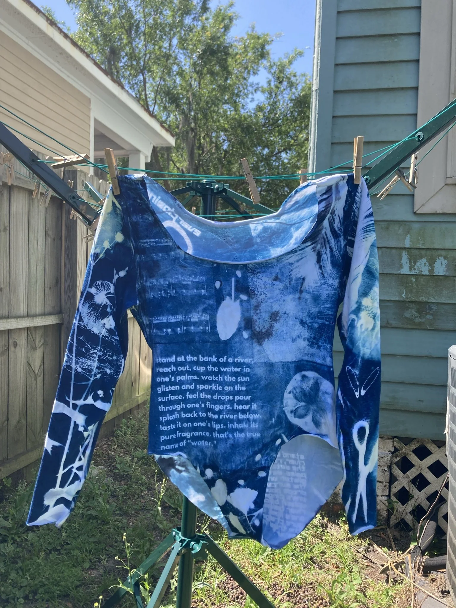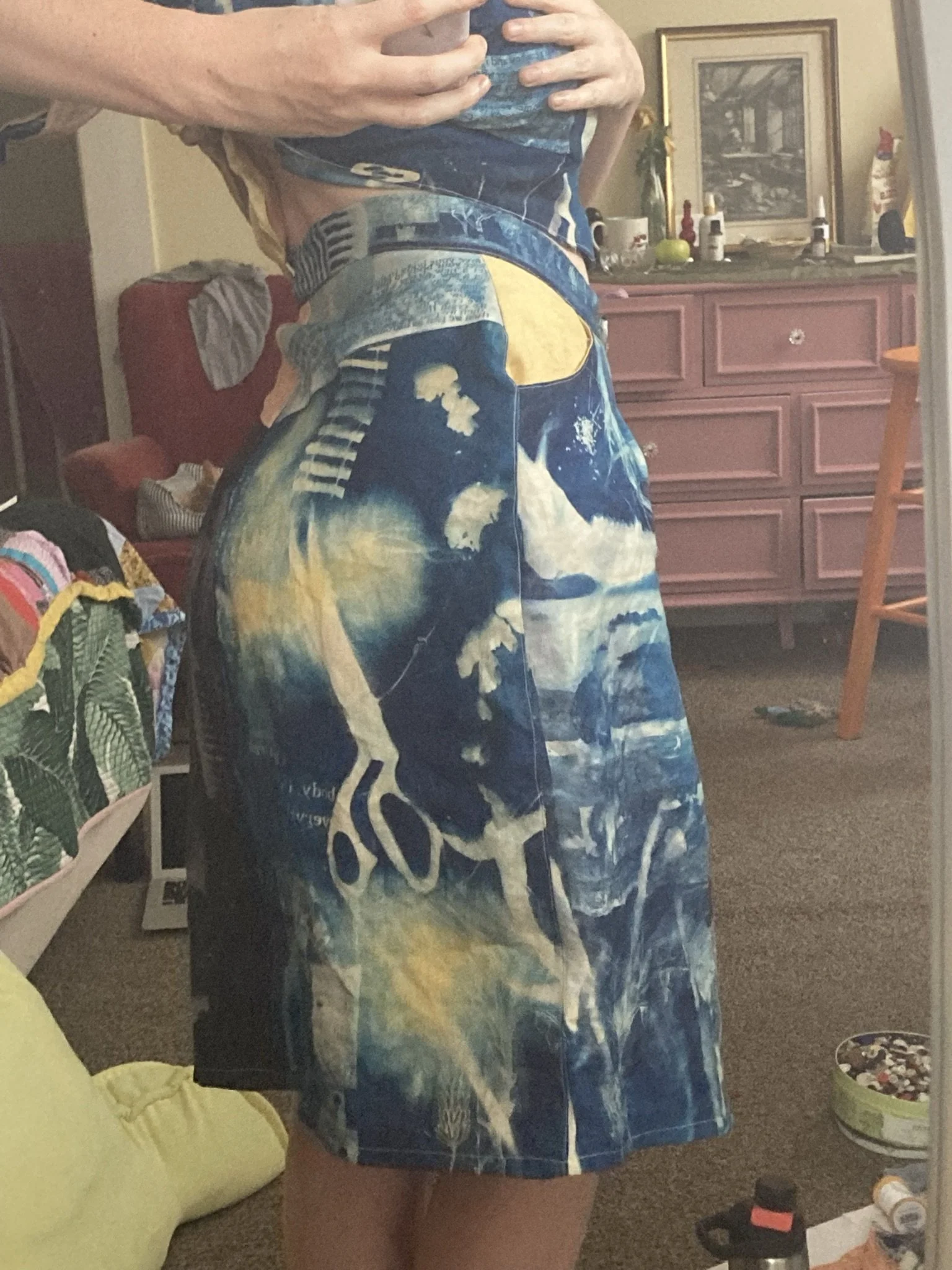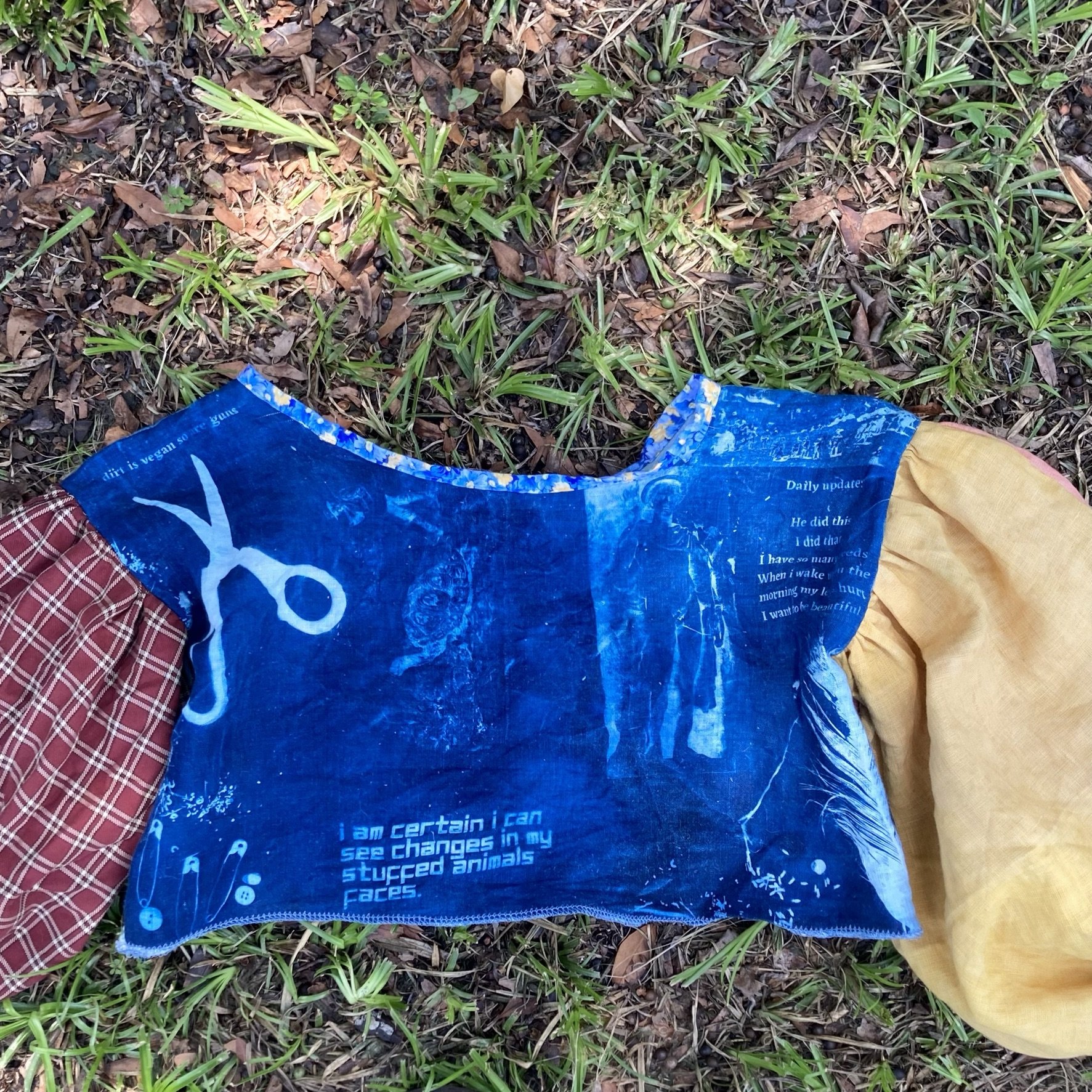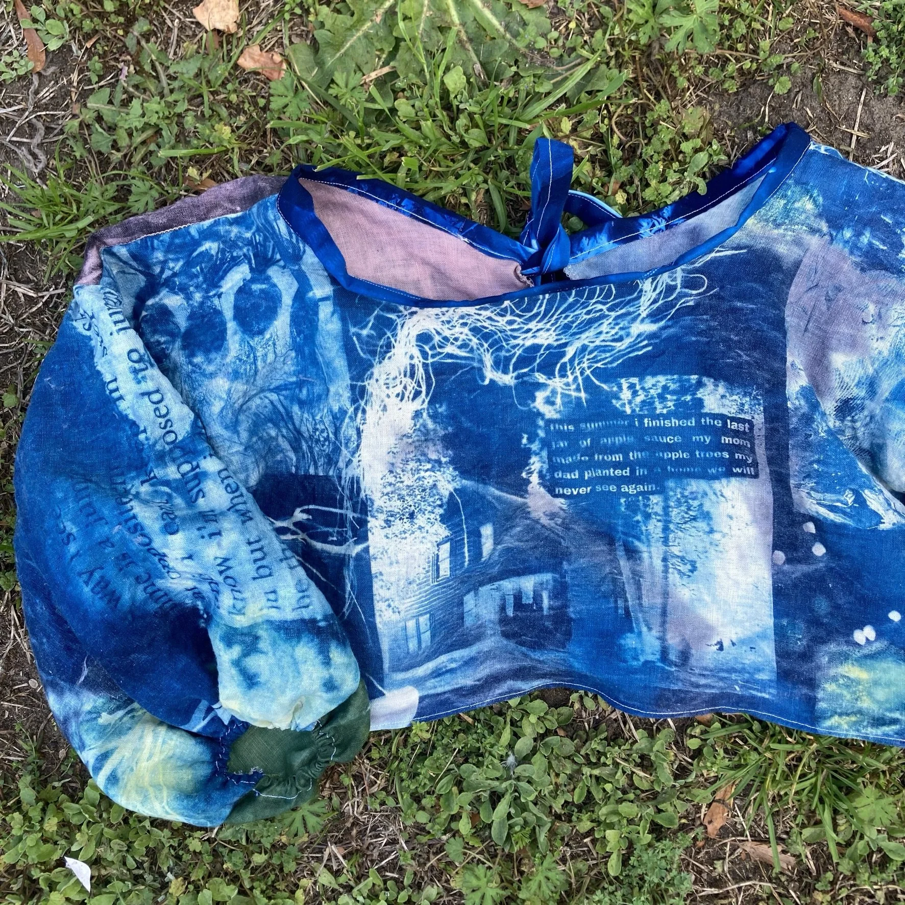 i’ve been working with cyanotype for ten years. i treat 95% cotton with cyanotype base, expose images i produce using a microscope, graphic design software, google images, my camera roll, etc in natural light or under indoor UV lamps and then sew the fabric into things you can wear. cyanotype is light fast and PH sensitive. they are more sculptural than meant for every day wear. like clothes you wear for prayer. you kind of remove yourself from your day to day inside of these. you run in the sprinkler until the sun fades your meaning. or whatever.