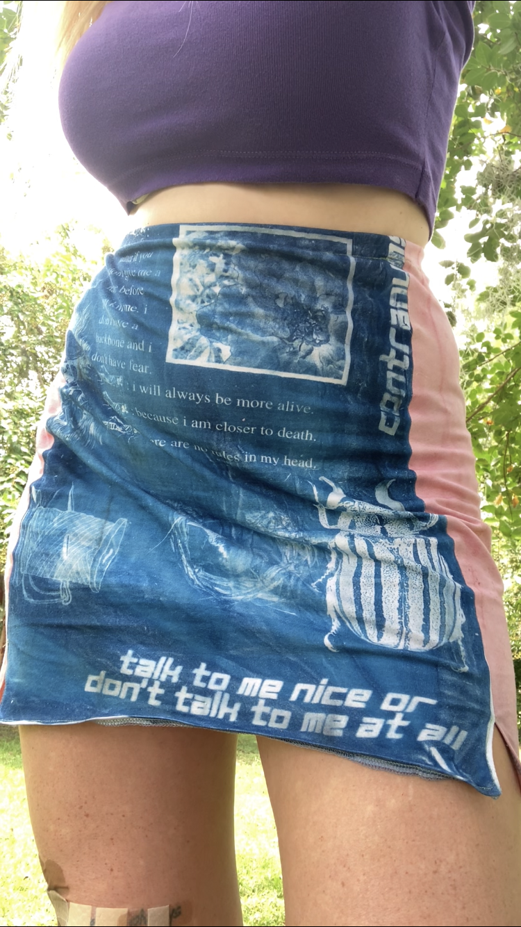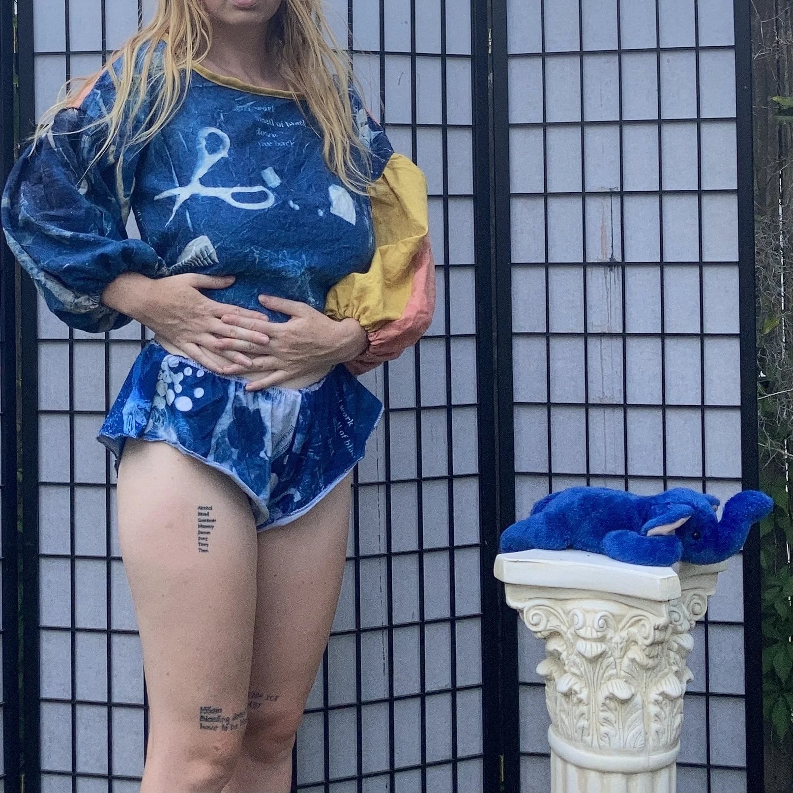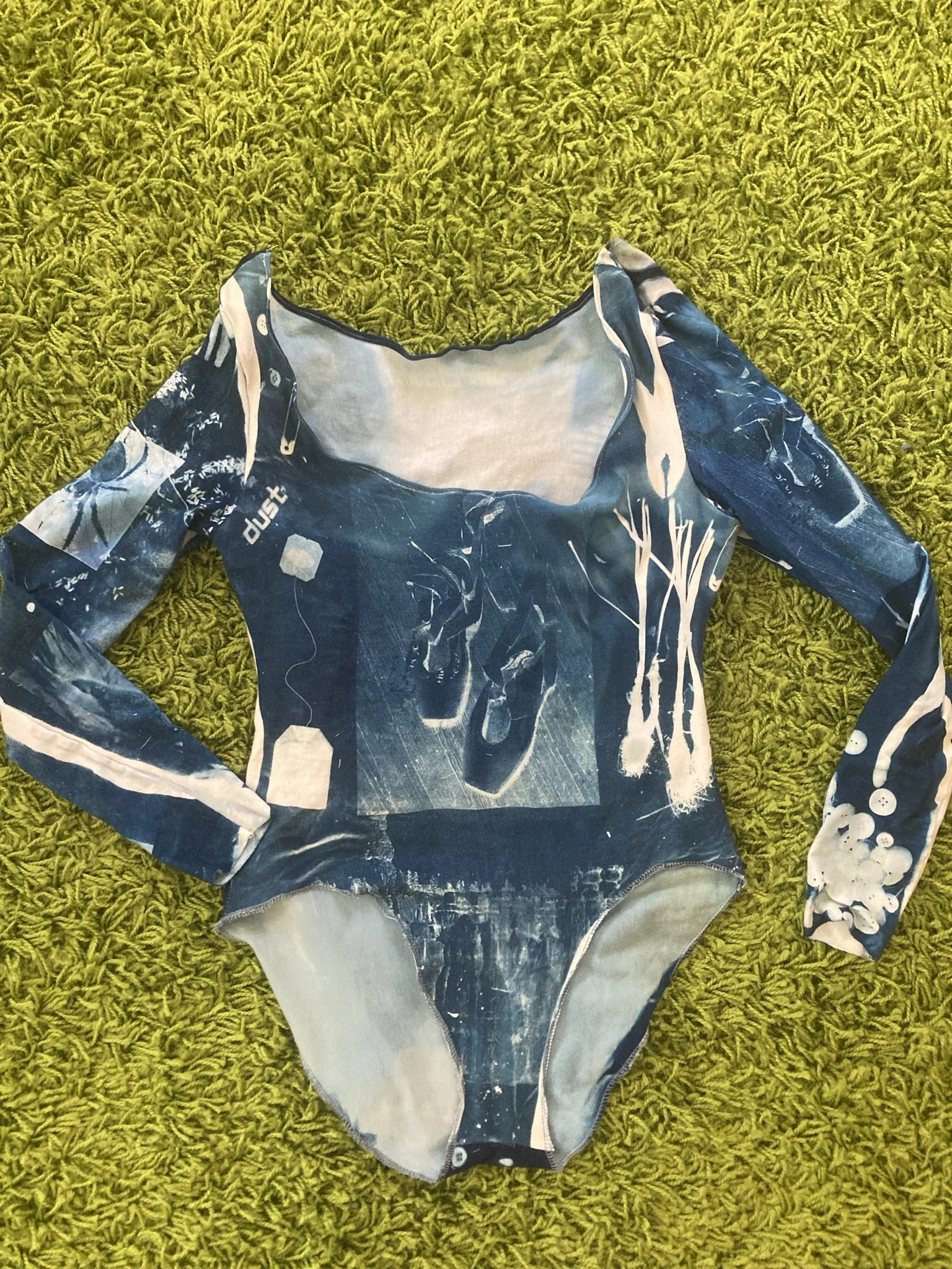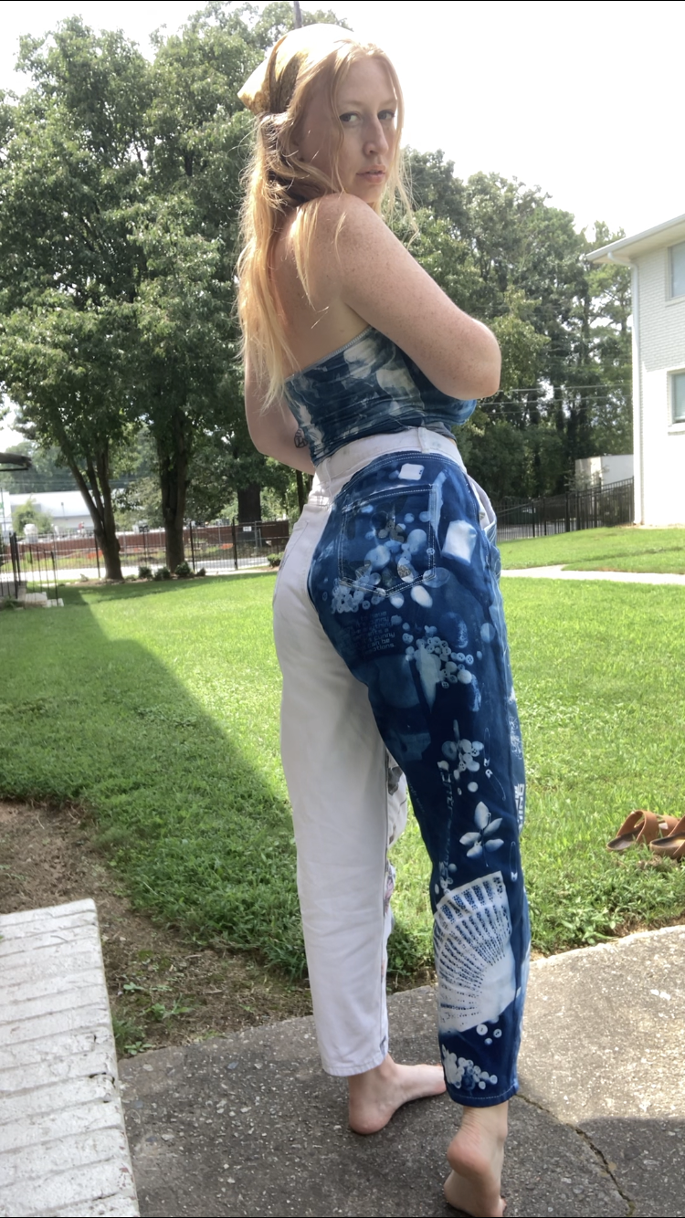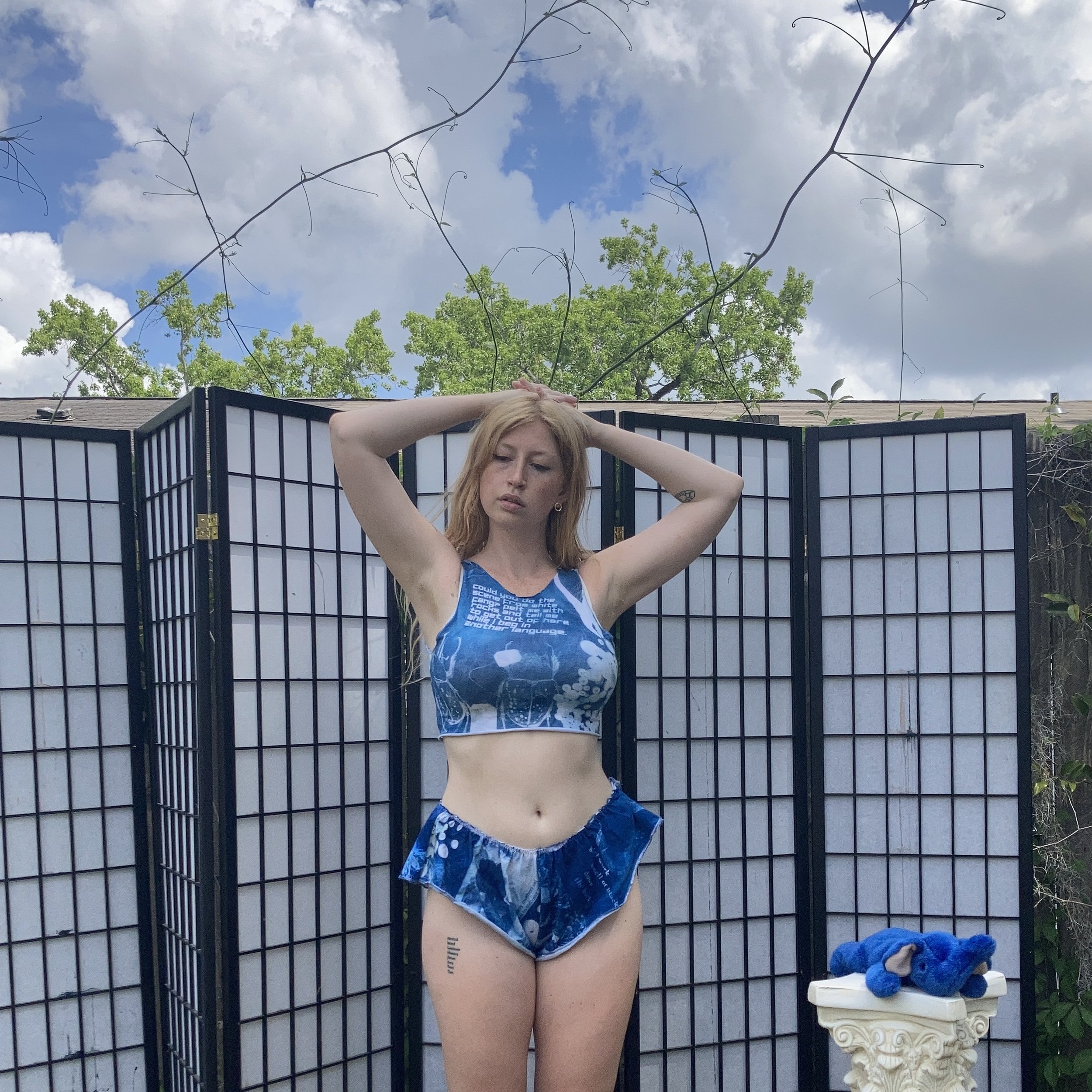 i’ve been working with cyanotype for ten years. i treat 95% cotton with cyanotype base, expose images i produce using a microscope, graphic design software, google images, my camera roll, etc in natural light or under indoor UV lamps and then sew the fabric into things you can wear. cyanotype is light fast and PH sensitive. they are more sculptural than meant for every day wear. like clothes you wear for prayer. you kind of remove yourself from your day to day inside of these. you run in the sprinkler until the sun fades your meaning. or whatever.