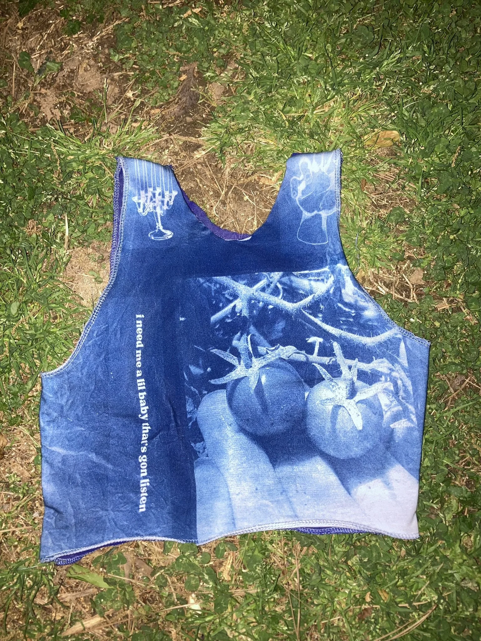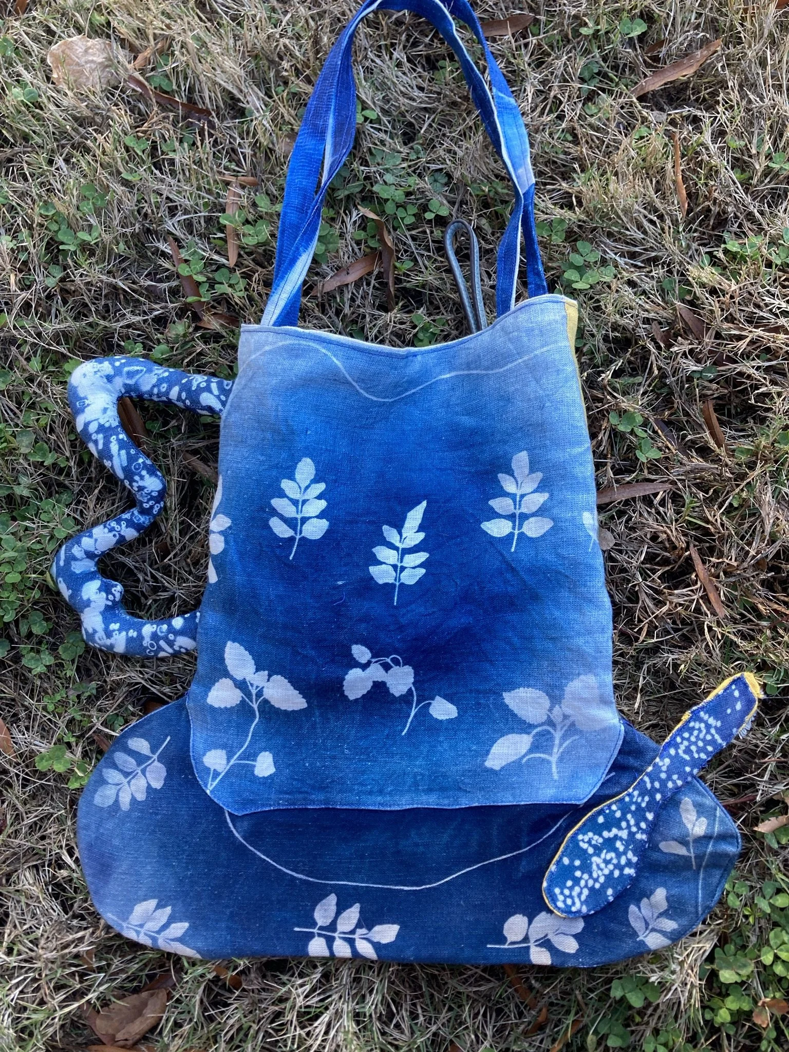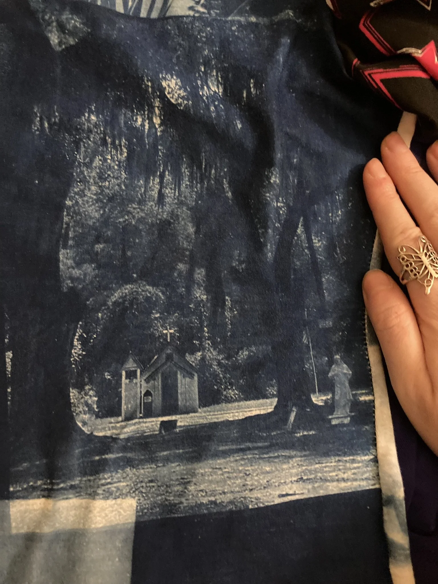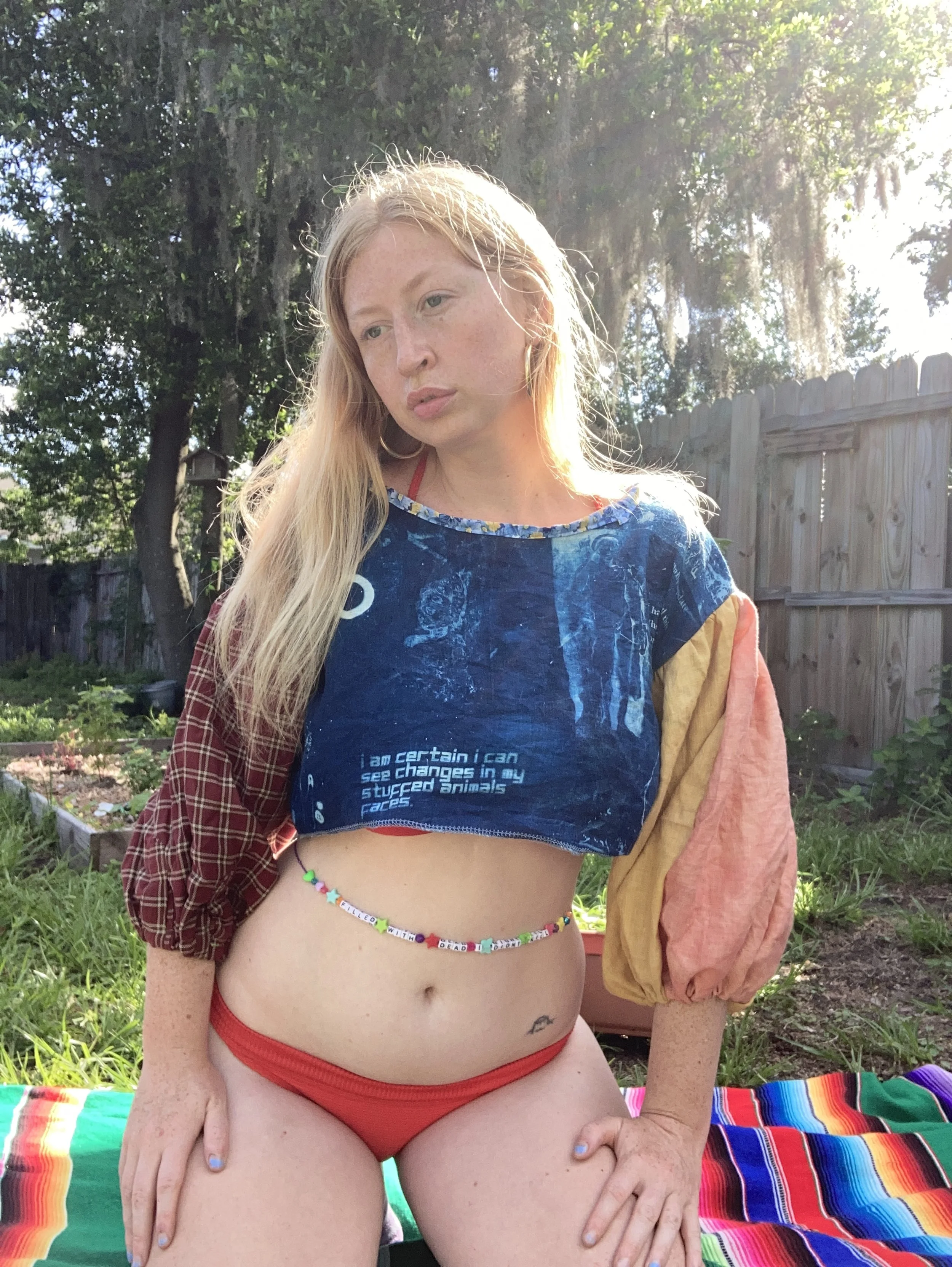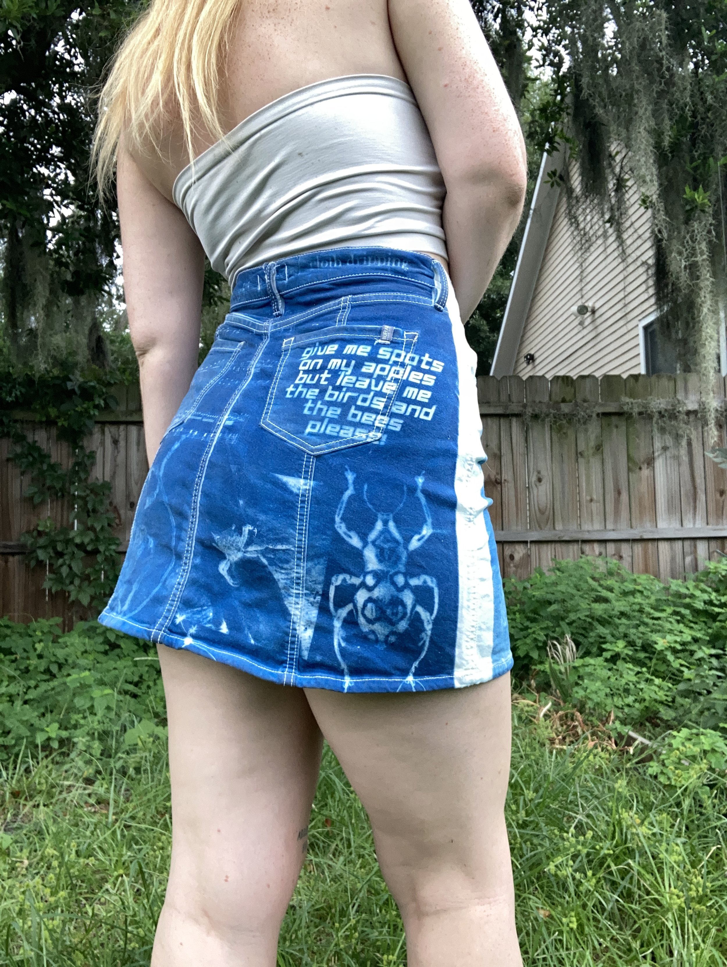 i’ve been working with cyanotype for ten years. i treat 95% cotton with cyanotype base, expose images i produce using a microscope, graphic design software, google images, my camera roll, etc in natural light or under indoor UV lamps and then sew the fabric into things you can wear. cyanotype is light fast and PH sensitive. they are more sculptural than meant for every day wear. like clothes you wear for prayer. you kind of remove yourself from your day to day inside of these. you run in the sprinkler until the sun fades your meaning. or whatever.
