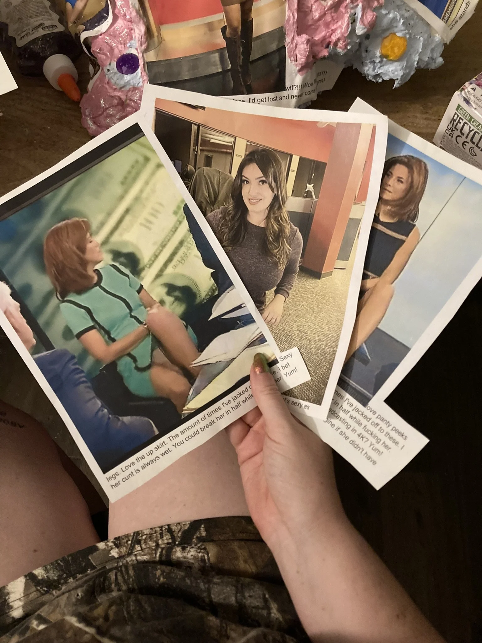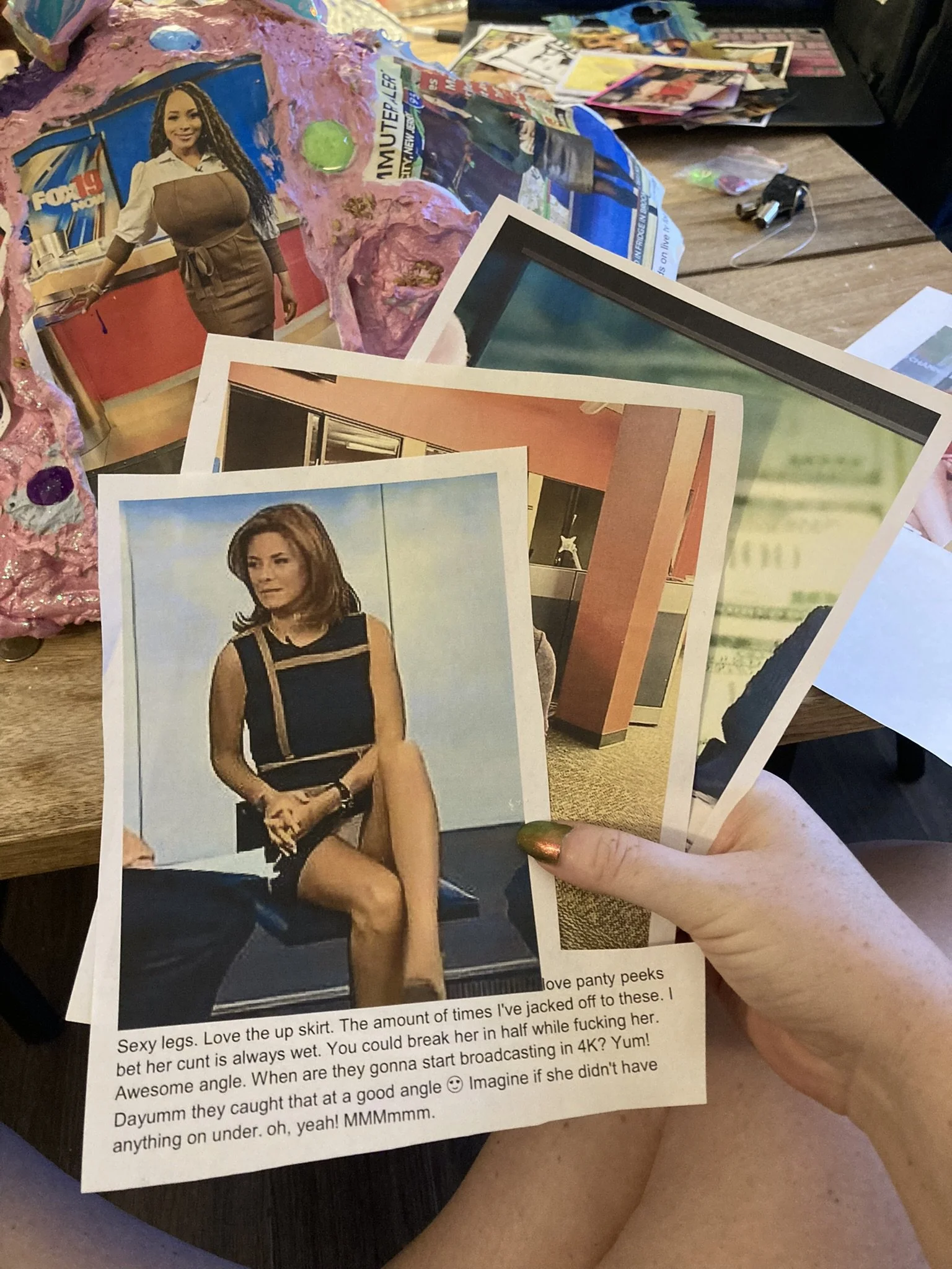 welcome to porn mountain. i had a library patron who was obsessed with newscaster porn. i could never catch him actually doing it, but there was evidence. it took forever but finally i got my chance to catch him and i kept all of his print outs. he would go onto these ancient websites of people who screengrabbed newscasters and then talked about their attraction to the women, how they’d like to fuck them. library patron would copy and paste these chats into a word document and then print them out. he’d also edit their grammar and spelling before printing.