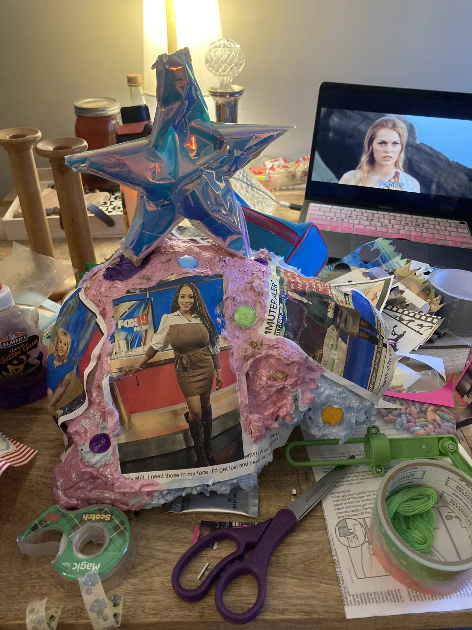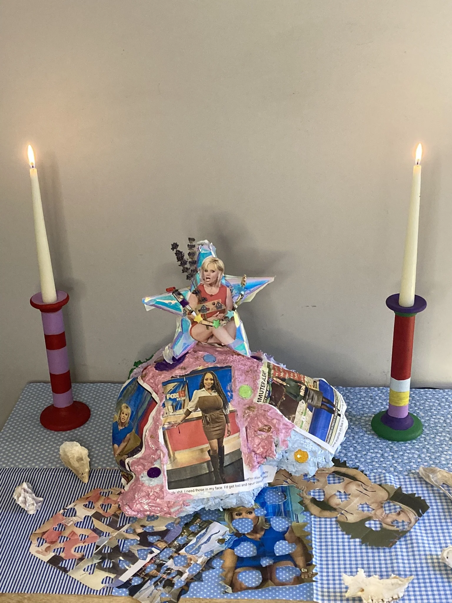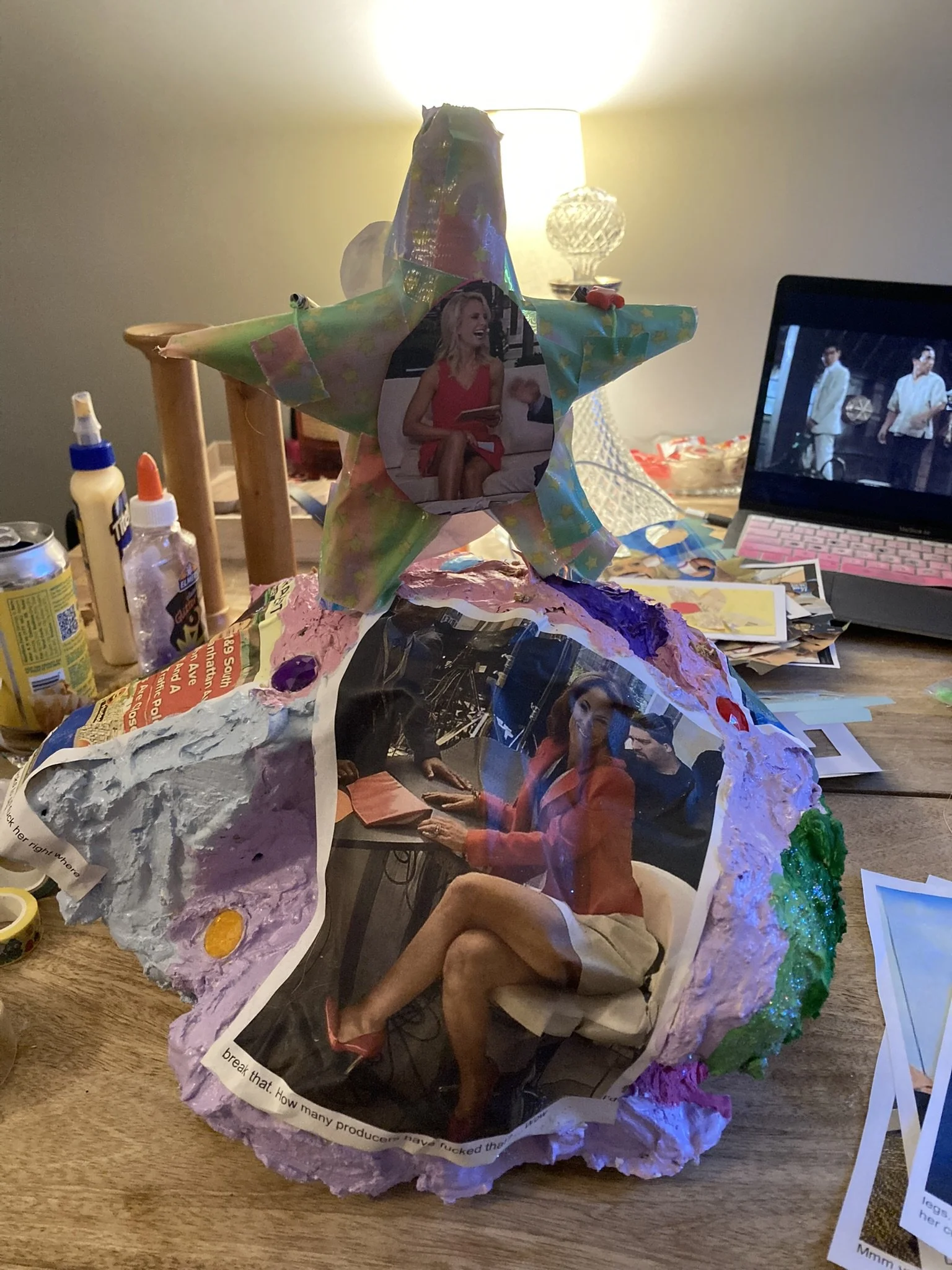 porn mountain is made out of trader joes grocery bags, plaster of paris, acrylic paint, plastic gems, glitter and images i kept from this guy. other images were cut into snowflakes. the star on top is made from crafy duct tape, dried lavender and paper beads i made from a pornographic comic he printed.