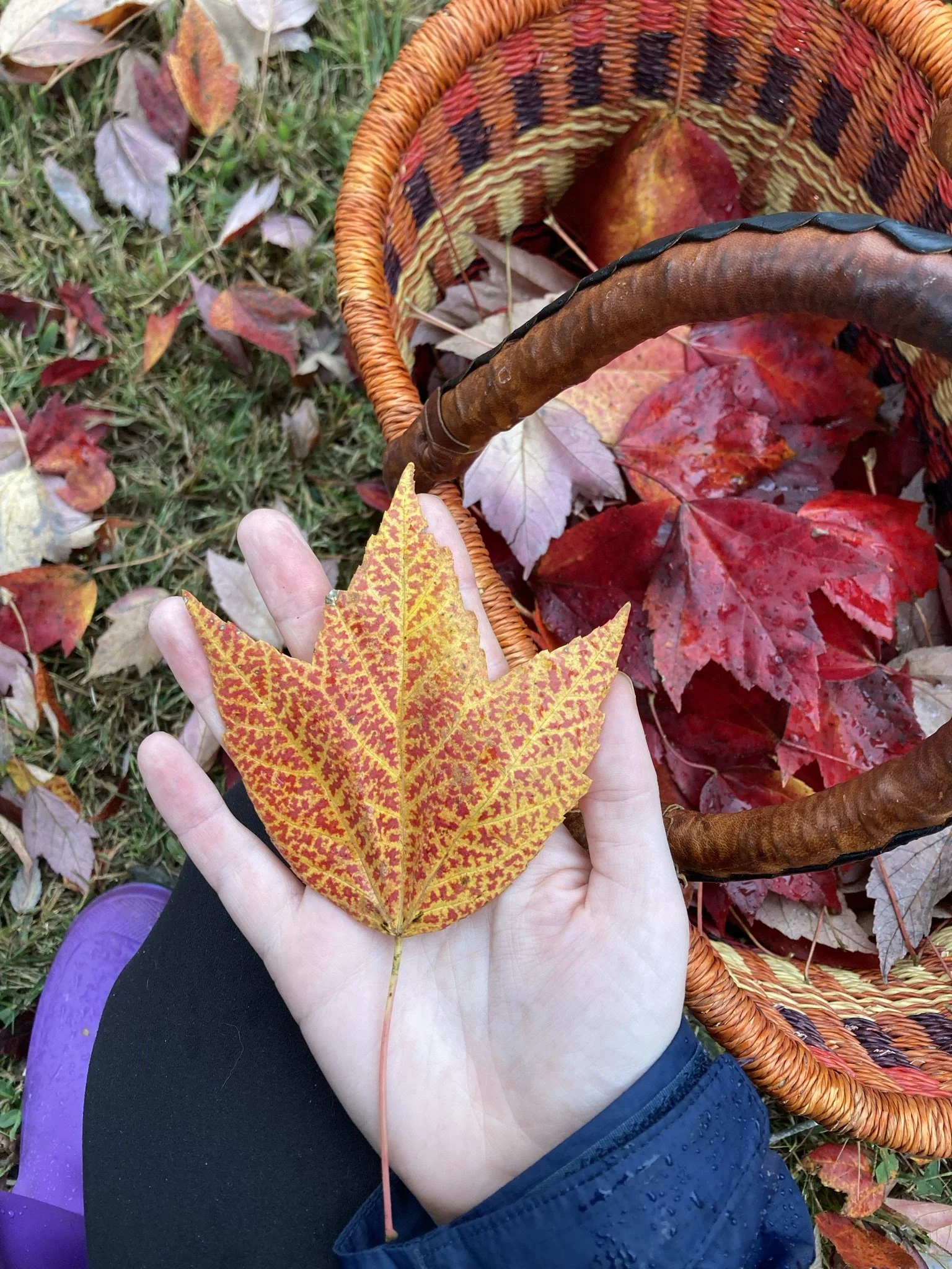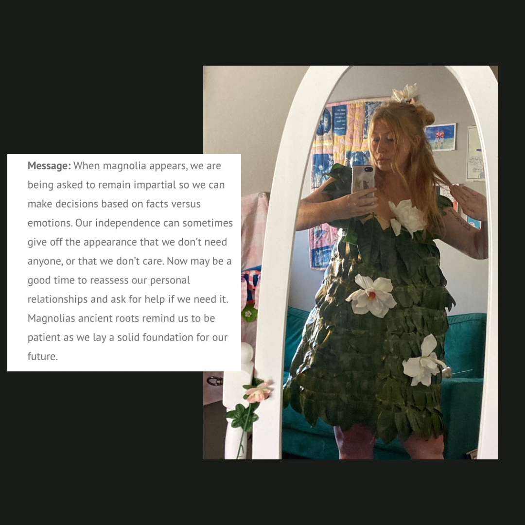 one year it was japanese maple the other it was magnolia. magnolia leaves smell better than the flowers, in my opinion. i sewed the leaves together. on the japanese maple dress you will find two black pieces of fabric on the straps to make taking the dress on and off easier. no other fabric is used thru the dress and no fabric is used on the magnolia dress. i just identified the trees and collected the leaves at my apartment complex.